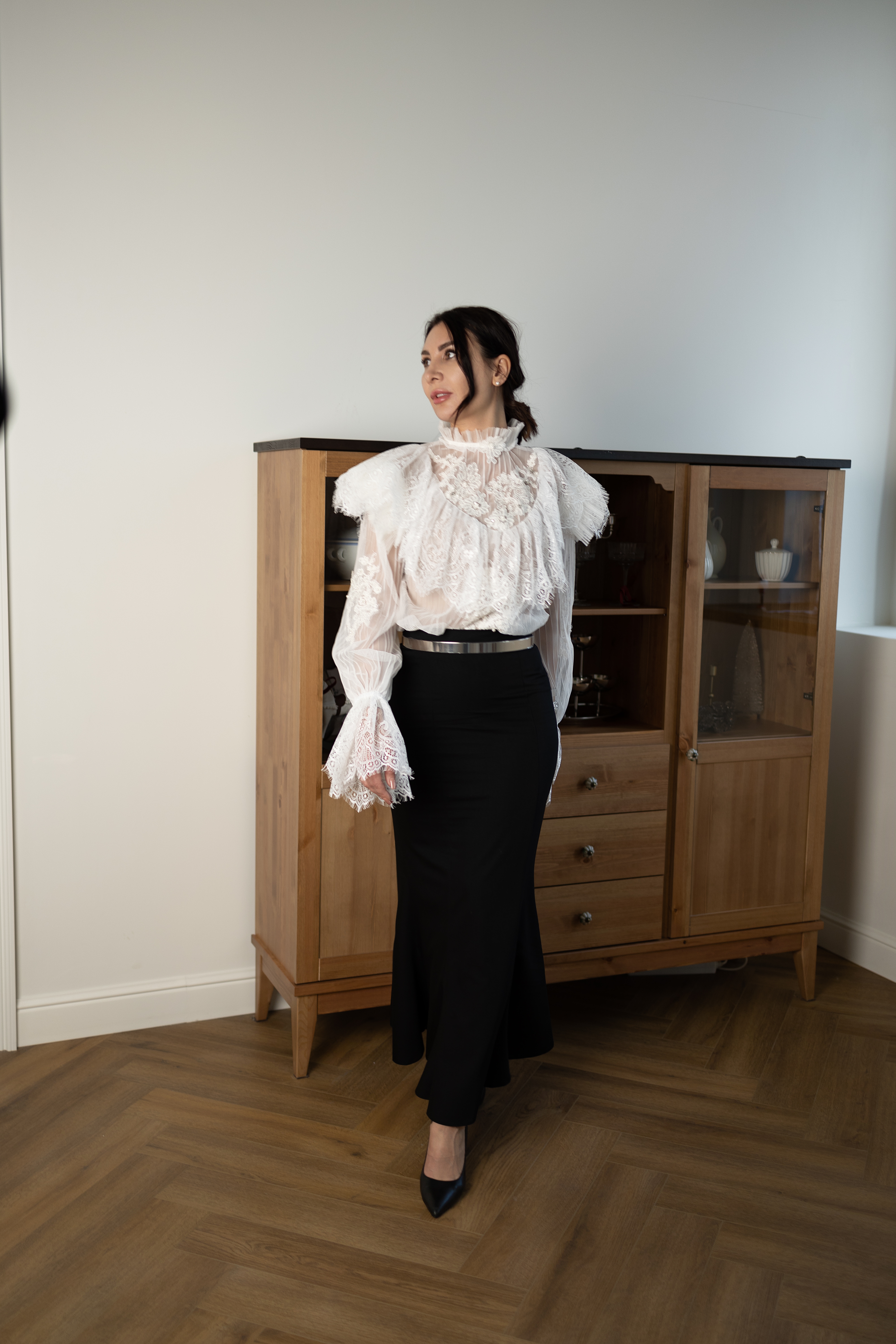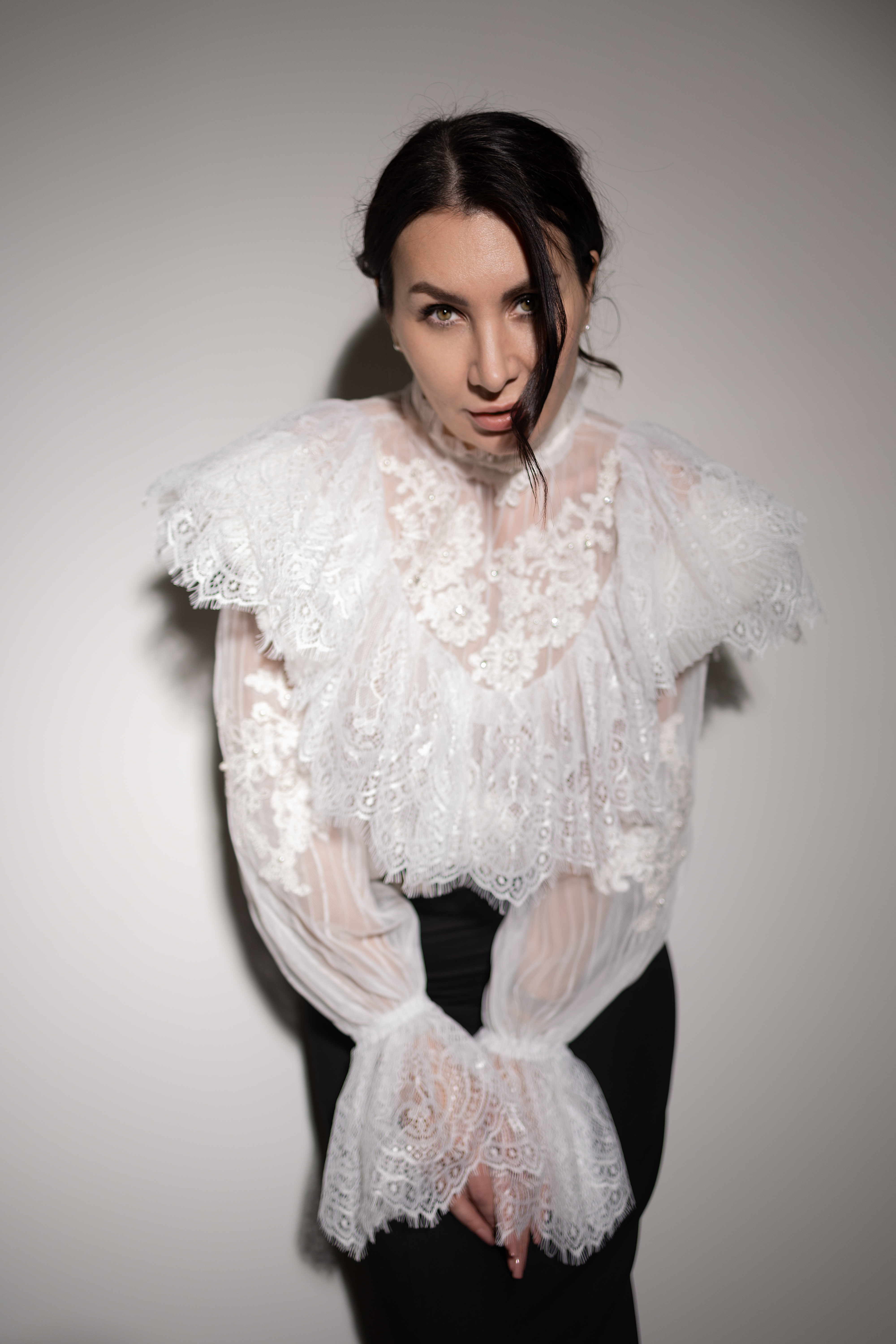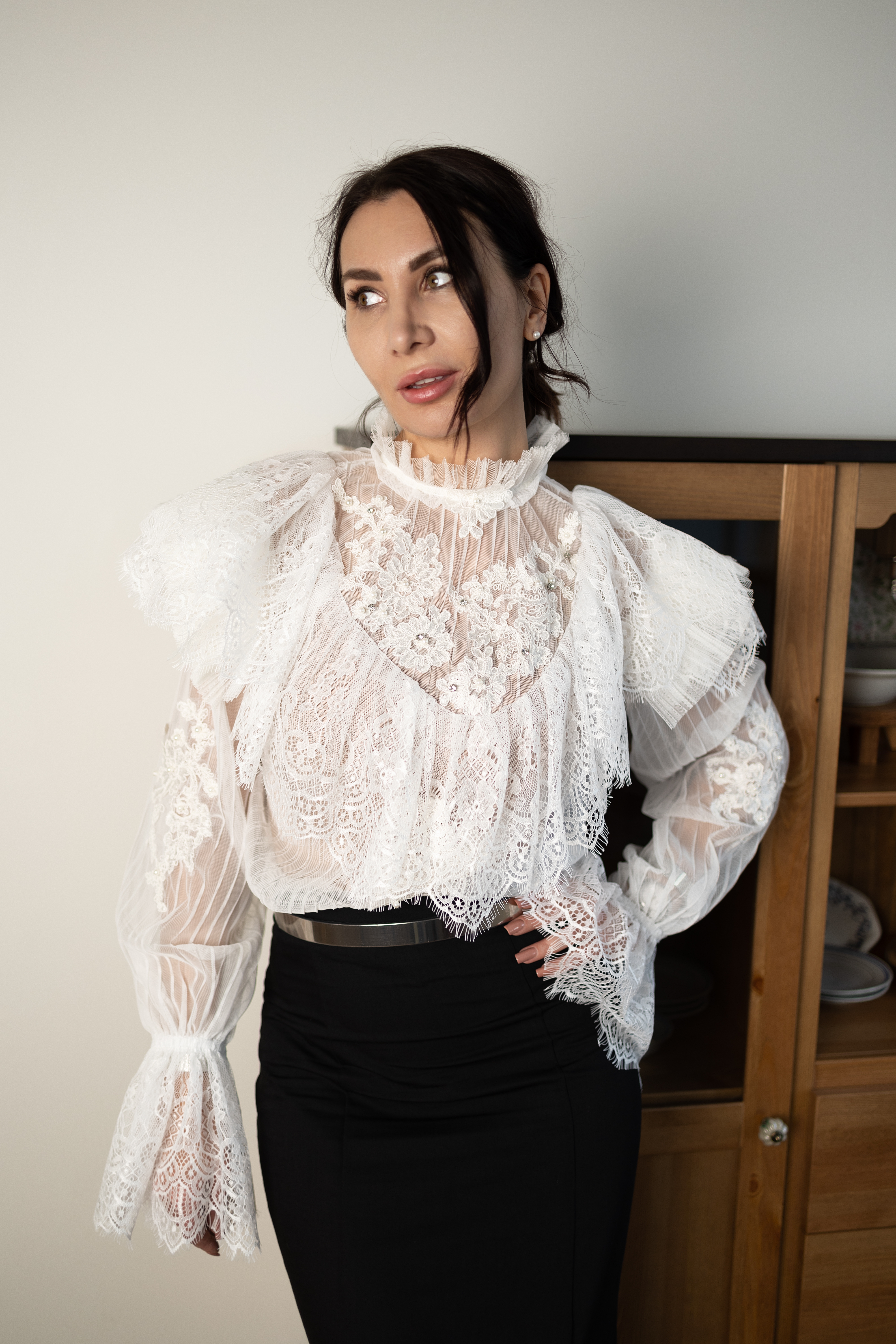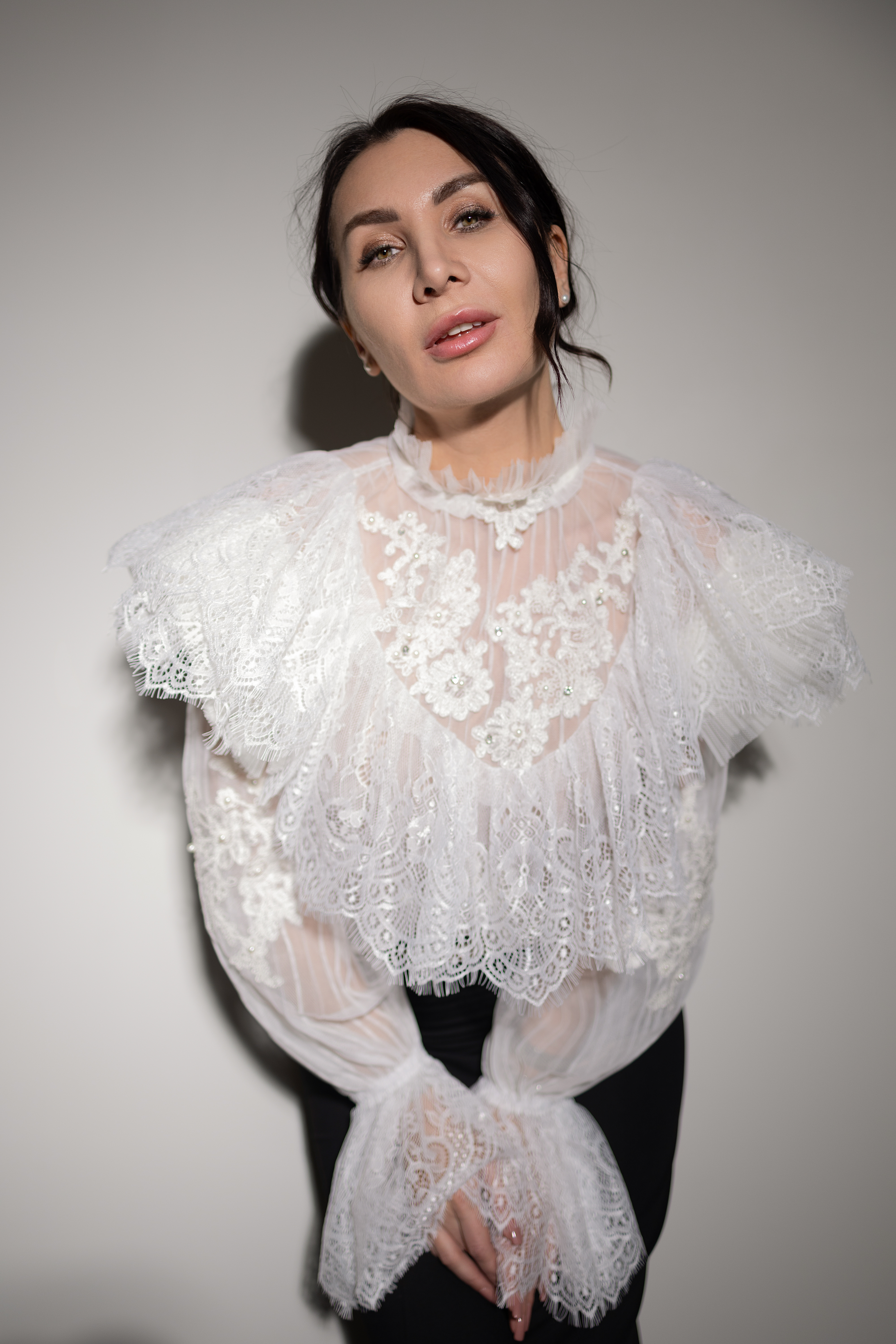 Роскошная блуза в белом цвете выполнена из невесомой сетки, плиссированной сетки и кружева и инкрустацией. Блуза декорирована кружевными элементами ручной работы. Дизайн блузы продуман таким образом, что вы точно будете самой запоминающейся героиней вечера, а может быть и дня. Всё зависит от ваших амбиций и желания блистать.