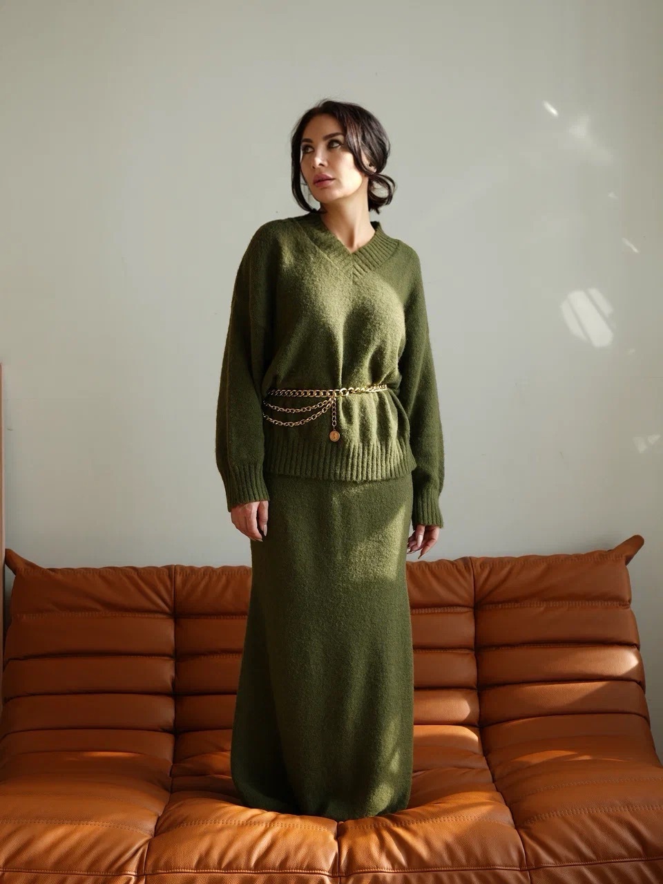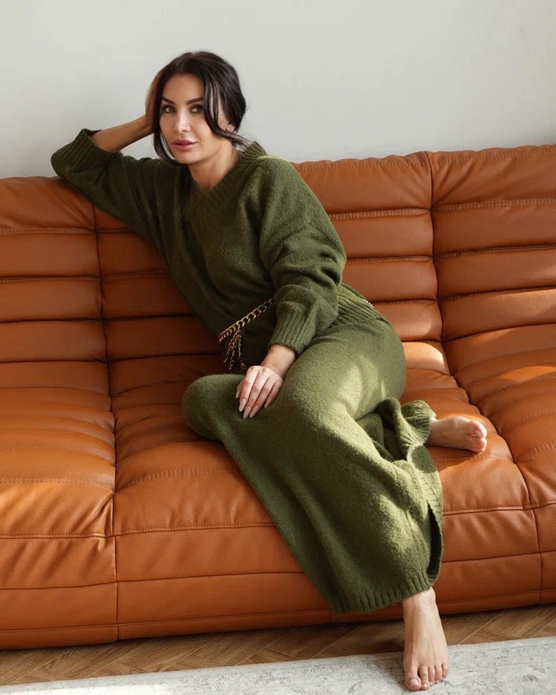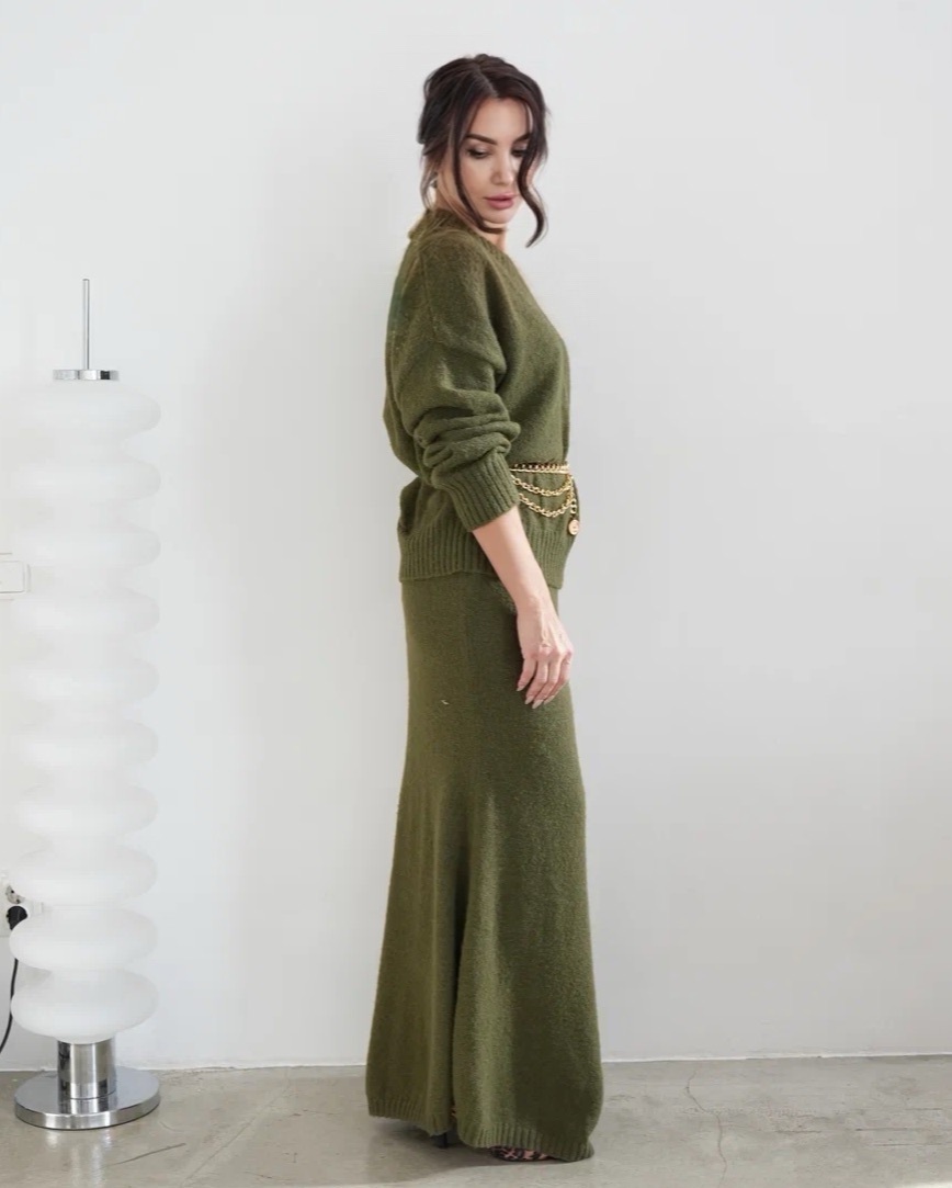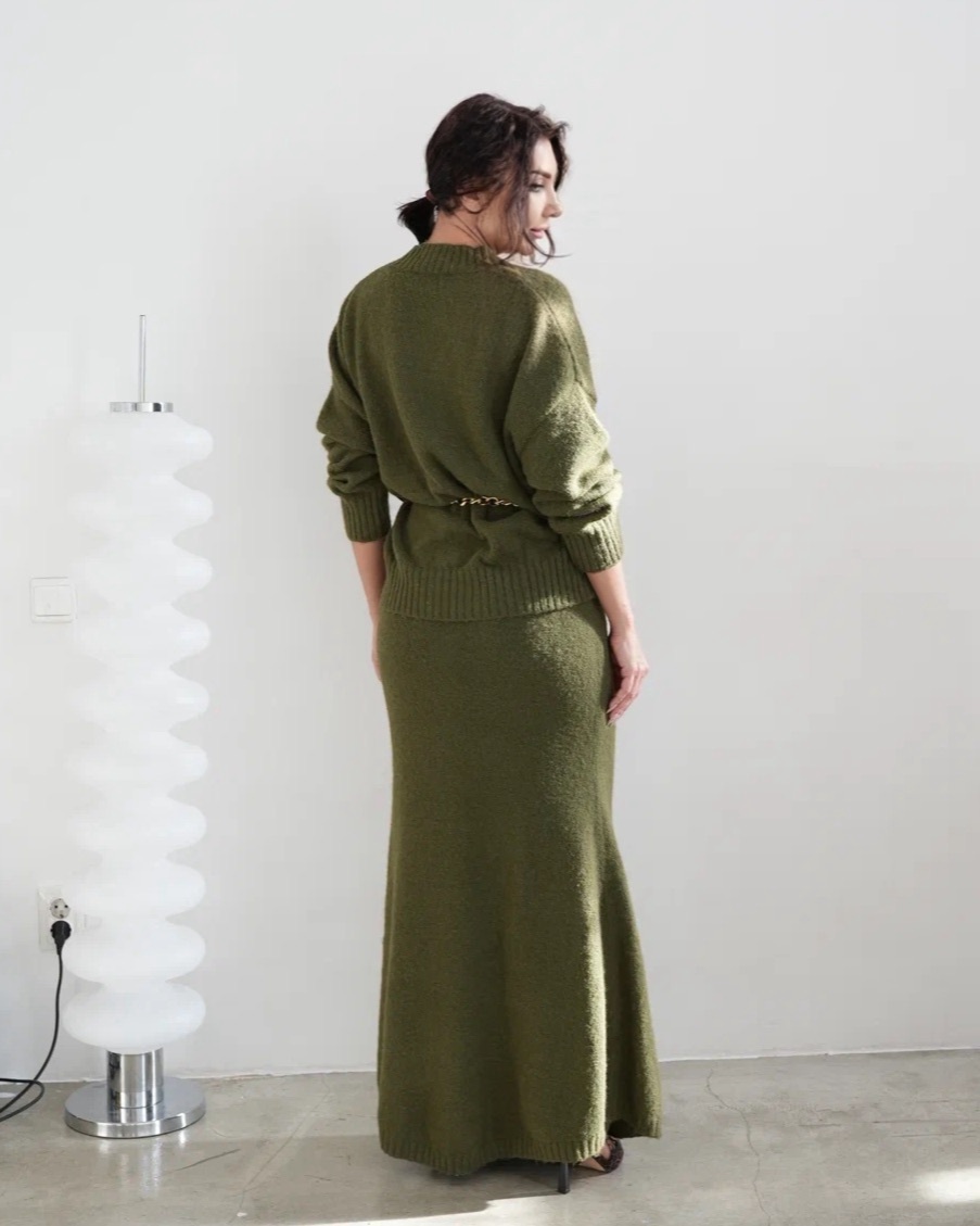 Комплект состоит из свободного джемпера и юбки макси с удобным эластичным поясом.