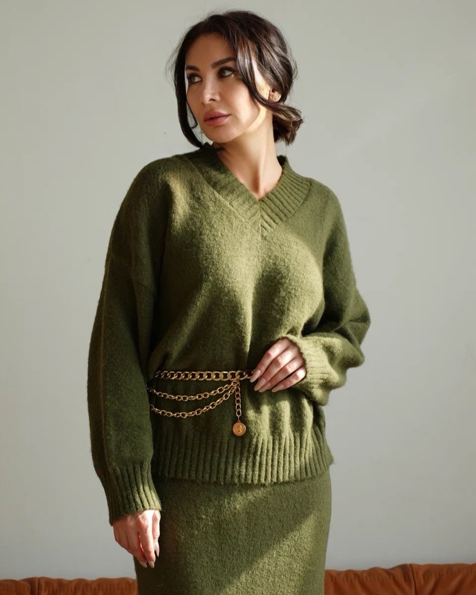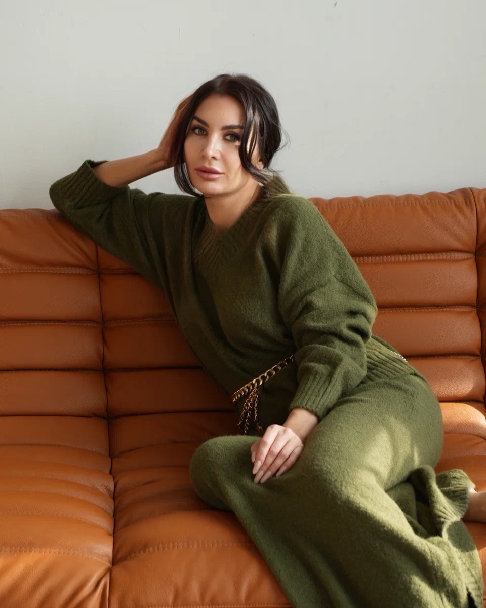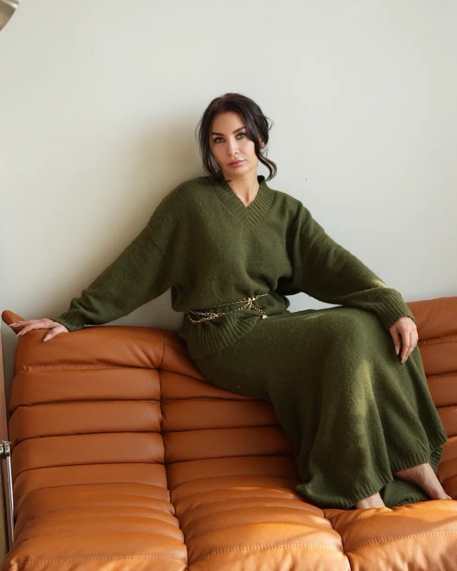 Комплект состоит из свободного джемпера и юбки макси с удобным эластичным поясом.