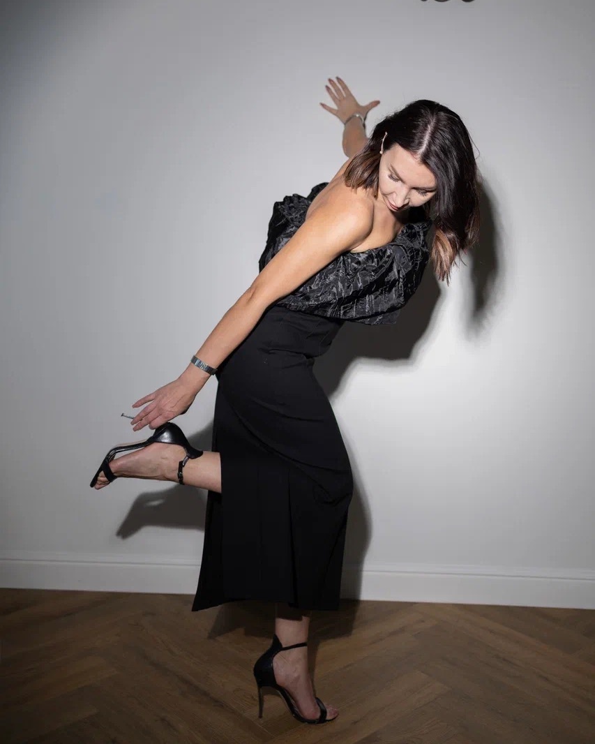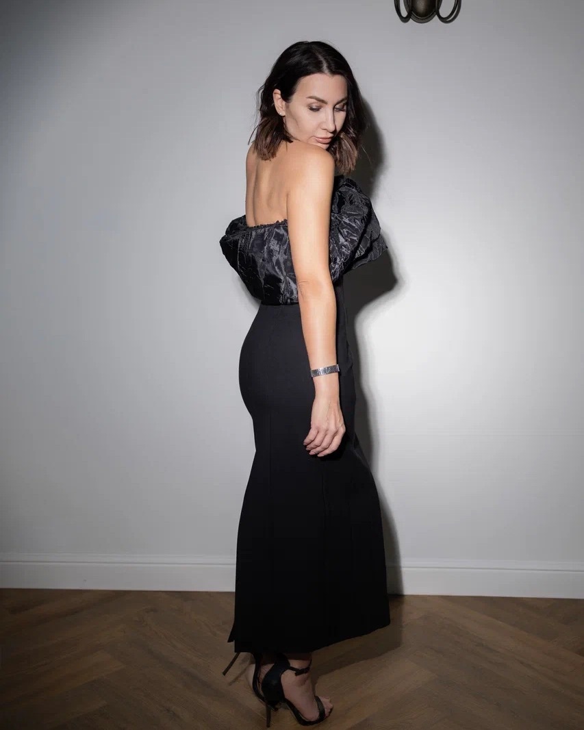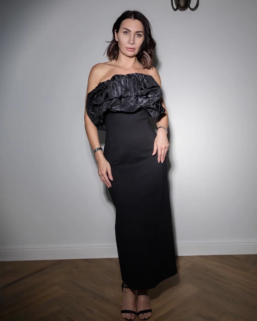 В одном варианте — строгая, минималистичная линия, в другом — эффектный акцент с couture‑настроением. Такой подход делает платье идеальным решением как для вечернего выхода, так и для мероприятий, где важно быть уникальной.