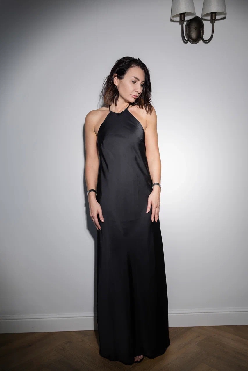 Макси‑платье из гладкого шёлка создано для тех моментов, когда хочется сиять без лишних слов. Простота силуэта спереди подчёркивает изысканность ткани, а открытая спина превращает образ в по‑настоящему запоминающийся. Горловина‑хальтер делает посадку визуально лёгкой и вытягивает линию плеч, а жемчужная цепочка по спинке играет роль украшения — тонко, деликатно, с лёгким намёком на роскошь. При движении ткань мягко струится, образуя небольшую «качельку», создавая эффект воздушности.